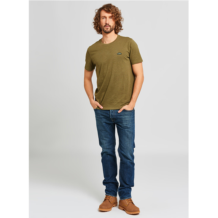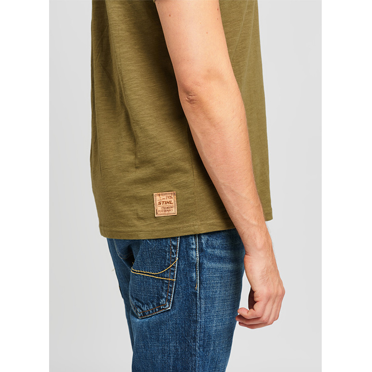 Bluzë me mëngë të shkurtra me jakë të rrumbullakët. Ikona e motosharrës në pjesën e gjoksit dhe stampa prej tape në pjesën e pasme. Pamje natyrale e ashpër falë ndërthurjes dhe nuancave në forma të parregullta, të holla dhe të trasha.