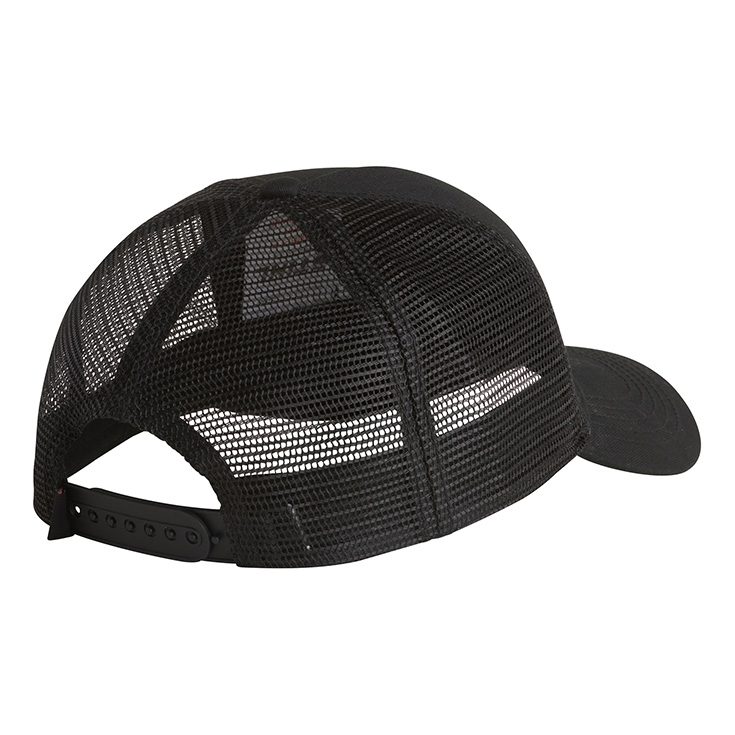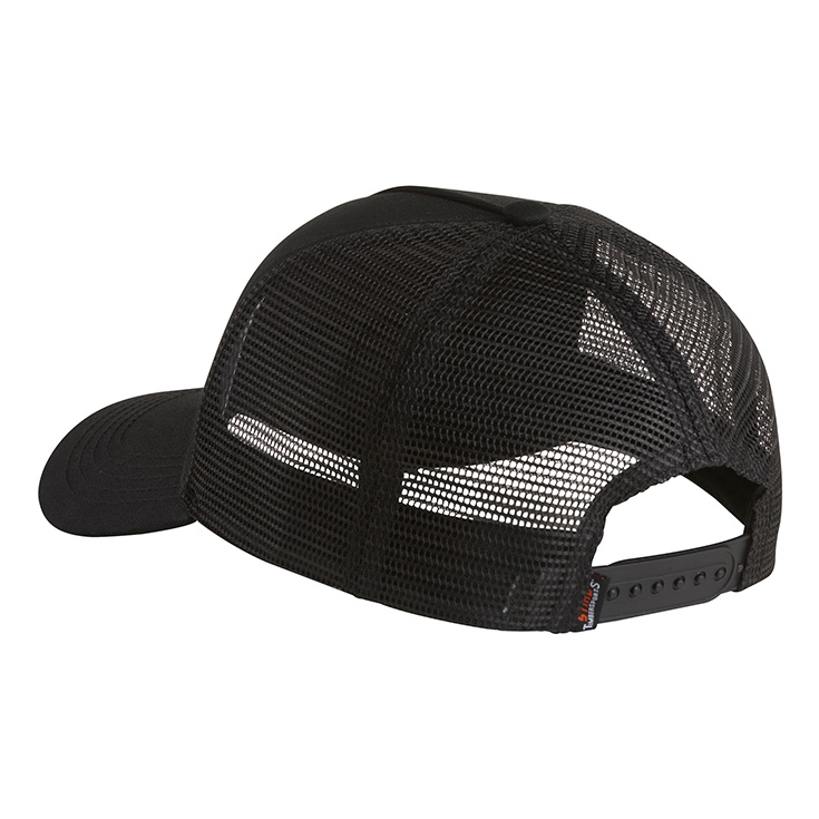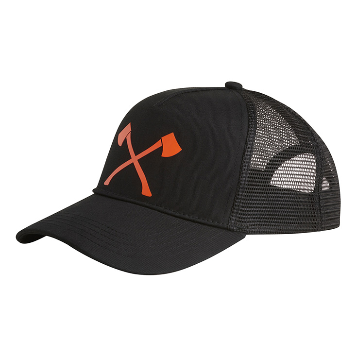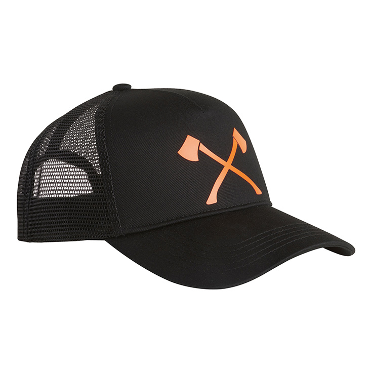 Kapele rrjete me sëpata të kryqëzuara, të stampuara në ngjyrë portokalli të ndezur mbi një sfond të zi. Struktura me rrjetë në pjesën e pasme është krijuar për ajrosje optimale. Madhësia e kësaj kapelje mund të ndryshohet duke ngushtuar rripin në pjesën e pasme të saj, ku gjendet edhe etiketa STIHL TIMBERSPORTS.